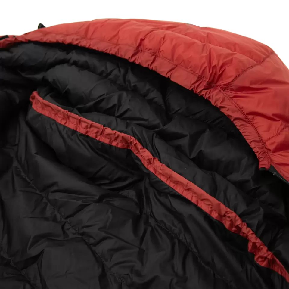 Le sac de couchage en duvet D400X avec 95/5 CQ-DOWN™ est un sac de couchage d'expédition pour les températures proches de zéro. Il est idéal pour les organisations professionnelles d'urgence et les expéditions. Grâce à l'utilisation de matériaux extrêmement légers et de duvet d'oie des neiges de qualité supérieure, le D 400x ne pèse que 853 g. Notre duvet n'est pas imprégné de silicone afin de préserver ses propriétés naturelles. Grâce au légendaire système DIScover et à tout le savoir-faire de Carinthia, il maintient une limite de confort de -5°C. Système DIScover : la deuxième enveloppe extérieure protège le duvet de l'humidité et offre une performance maximale du sac de couchage. Le tissu extérieur est en outre fortement déperlant et se présente dans la couleur rouge signalétique.Grâce aux fixations anti-snag et aux les cordons plats et rigides à l'intérieur rendent la manipulation beaucoup plus agréable.